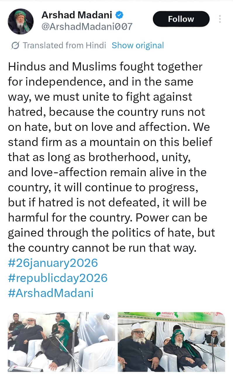 As India celebrated its 77th Republic Day on January 26, 2026, Jamiat Ulema-e-Hind president Maulana Arshad Madani delivered a heartfelt address that cut through the noise of contemporary debates. Speaking with deep emotion, he recalled the joint sacrifices of Hindus and Muslims during the freedom struggle, emphasizing that the same spirit of solidarity must now defeat hatred in all its forms.